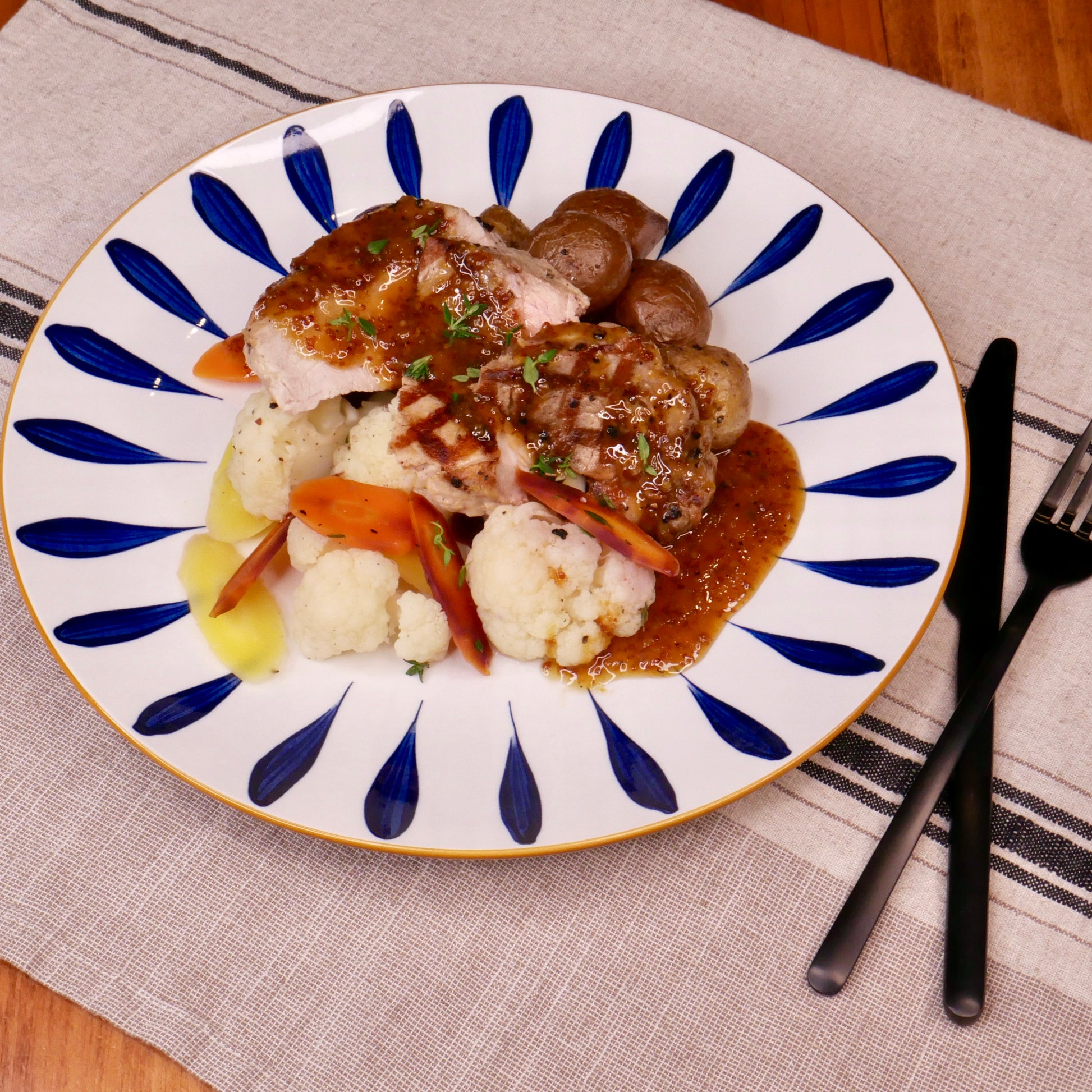 Ingrédients: Côtelette de porc, pommes de terre, chou-fleur, carottes, moutarde de dijon et à l’ancienne, huile, sirop d’érable, lime, huile à l’ail, ail, gingembre, thym, sel & poivre.